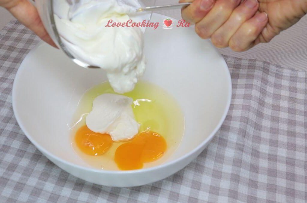 Соединяем яйца, соль и творог. Перемешиваем венчиком. У меня творог 5%, можно взять и обезжиренный, так калорийность будет ещё ниже.
