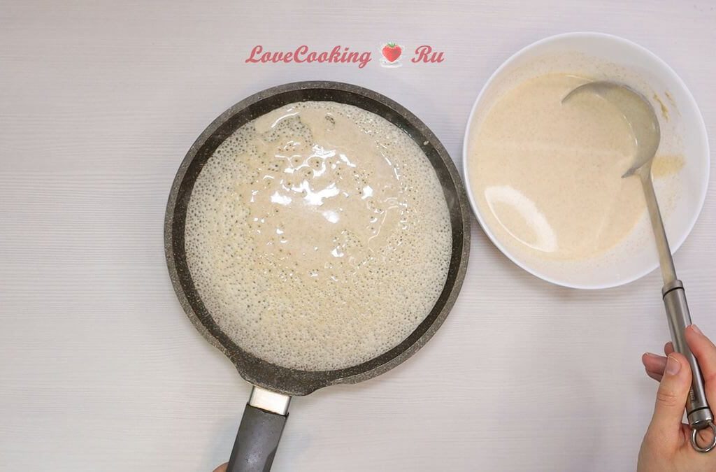 Сковороду только первый раз смазываем растительным маслом, хорошо разогреваем. Тесто каждый раз перемешиваем перед тем, как выливать на сковороду.
