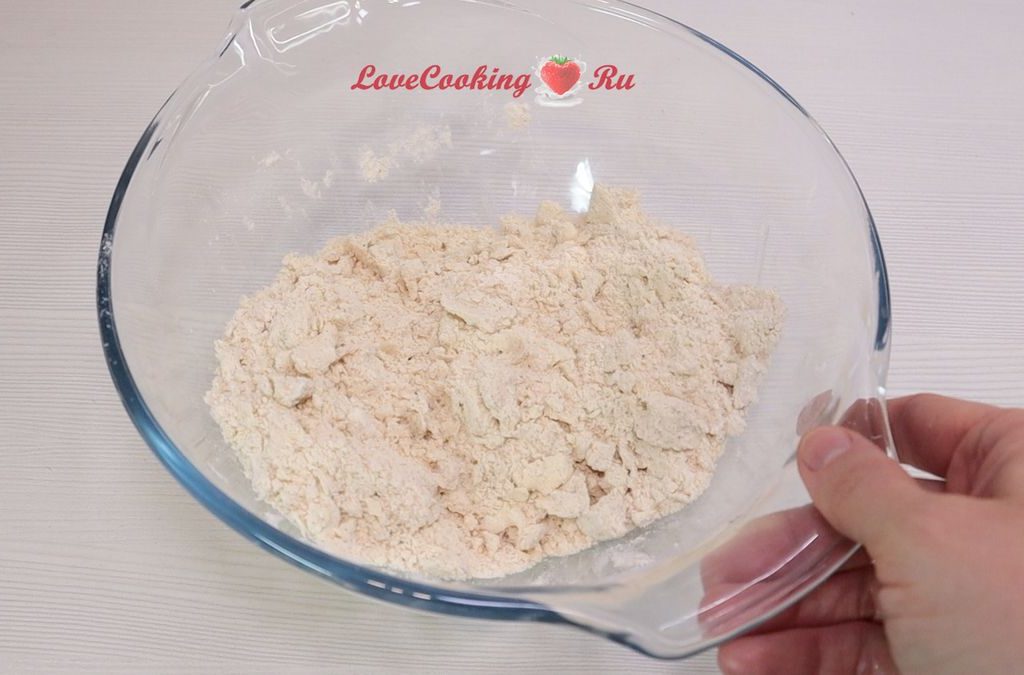 В глубокой чаше соединяем муку, разрыхлитель, соль, пряности и сливочное масло. Перетираем в крошку.