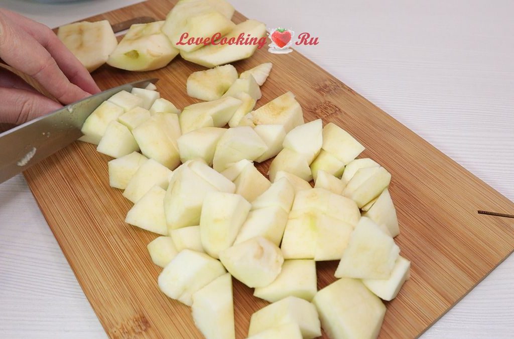 Яблоки очищаем и нарезаем крупными кубиками. Добавляем в муку, перемешиваем. Я брала кислые яблоки. Соус сладкий, поэтому кислые яблочки хорошо с ним сочетаются.