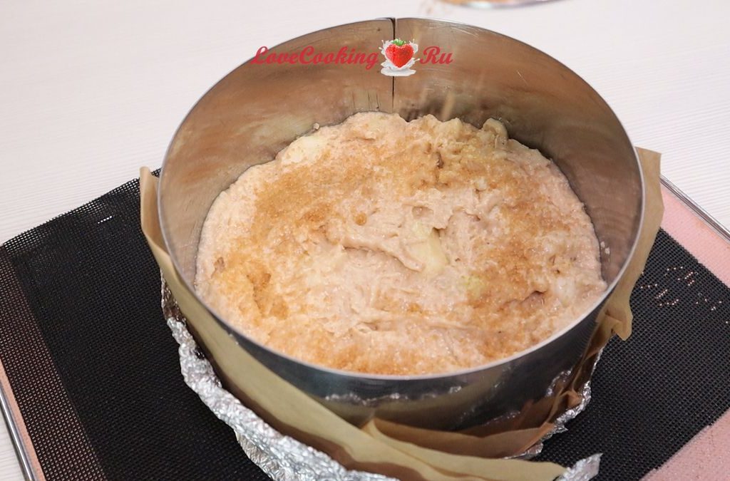 Стенки формы для выпечки смазываем маслом, дно застилаем пергаментной бумагой. Выкладываем тесто, разравниваем. Сверху присыпаем сахаром, лучше коричневым.
