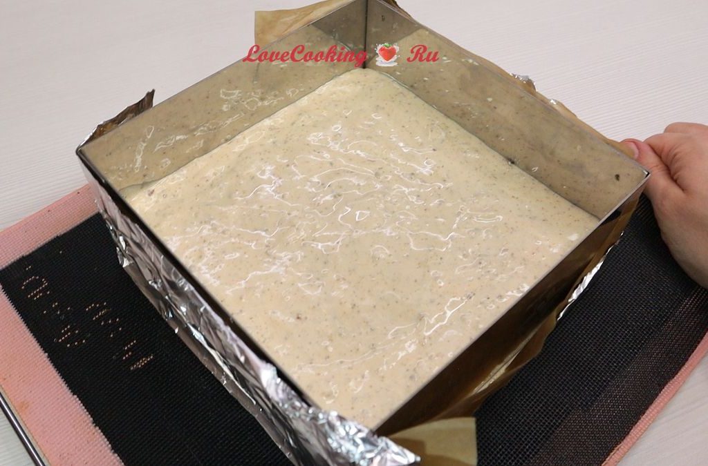 Переливаем тесто в форму 18х18 см. У меня рамка, дно которой затянуто пергаментом и фольгой. Стенки формы не смазываем. Несколько раз отстукиваем форму с тестом о рабочую поверхность.