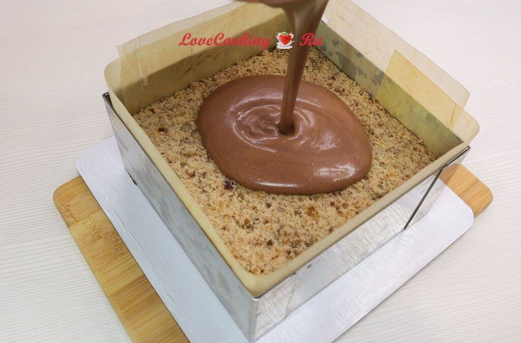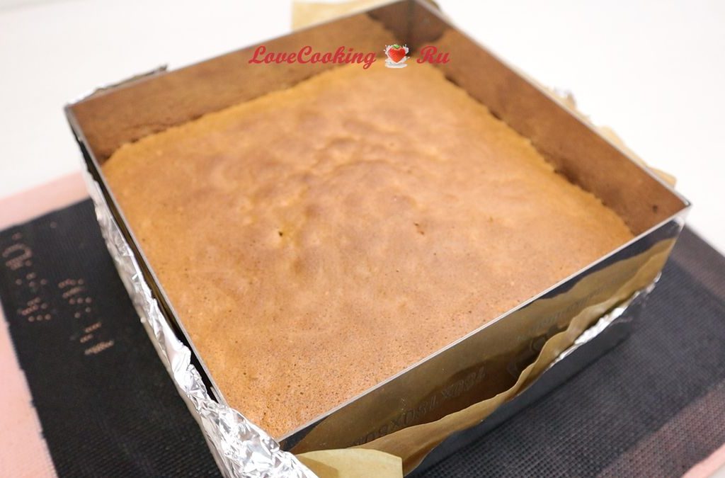 Торт собираем в рамке 16х16 см. Стенки формы я застилаю тефлоновым ковриком, мне так удобнее потом извлечь торт.