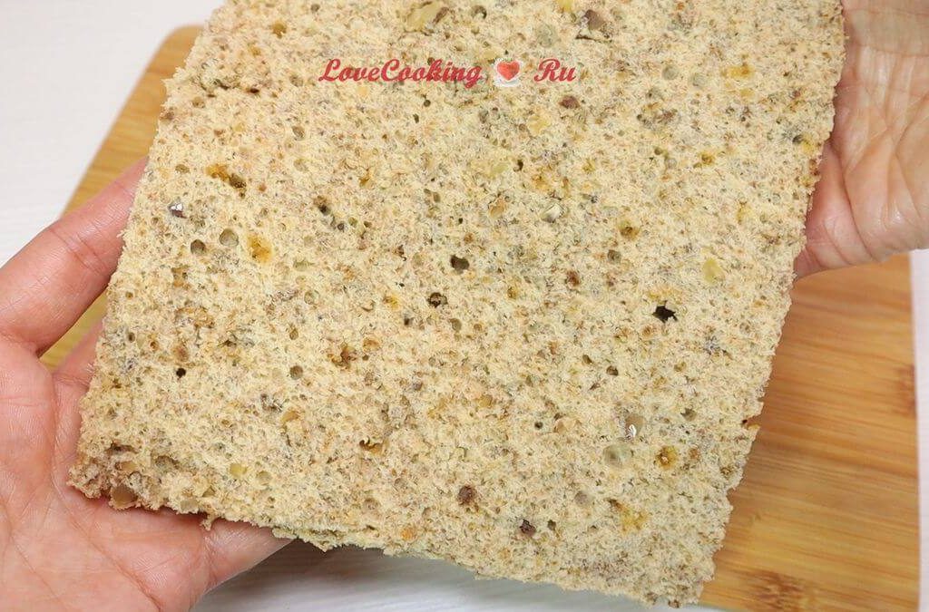 Верхнюю корочку срезаем, разрезаем бисквит на 3 коржа. Я обрезала бисквит до размера 16х16 см.