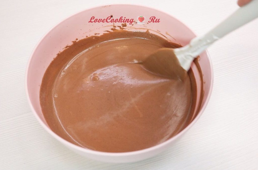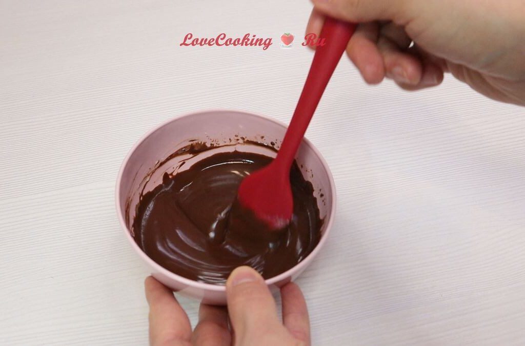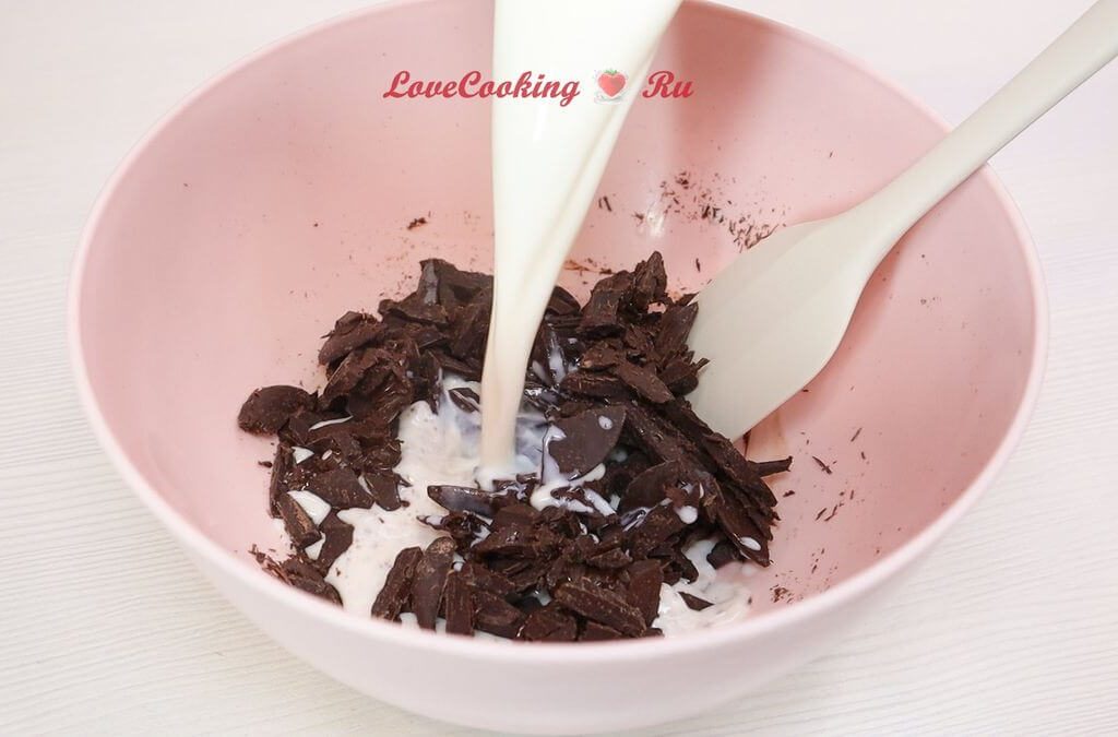 Шоколад немного топим в микроволновке или на водяной бане, он должен начать таять. Выливаем в него молоко. Перемешиваем.
