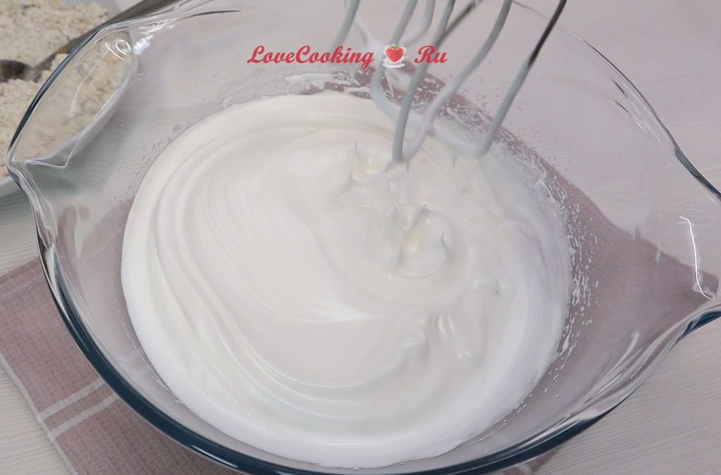 В яичные белки добавляем соль и взбиваем до появления пены. В 2-3 этапа засыпаем 75 г сахара, продолжая взбивать. Белки нужно взбить до устойчивых пиков.
