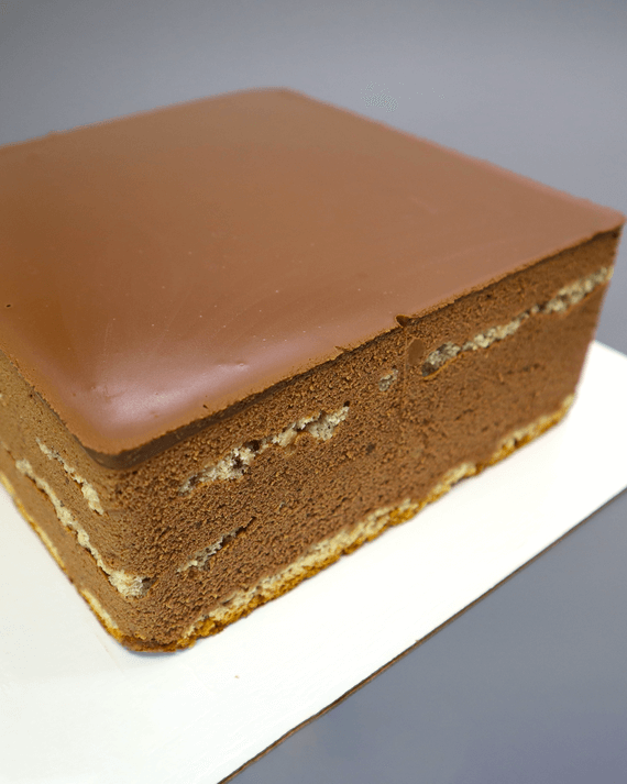 Выкладываем первый корж, заливаем муссом, далее идёт второй корж, мусс, третий корж, мусс.