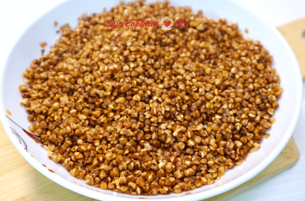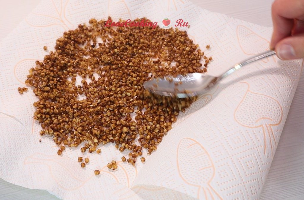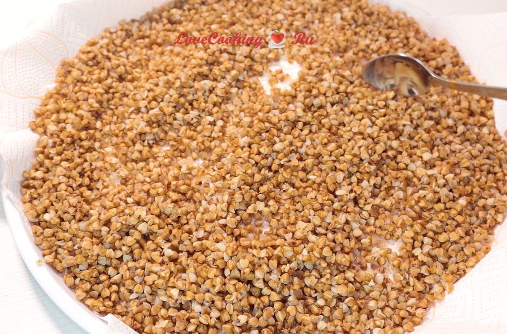 Воду сливаем. Даём гречке полностью высохнуть. Можно выложить её на бумажные полотенца и оставить на ночь, а можно высыпать на противень и подсушить в духовке при 50-70°С, периодически перемешивая.
