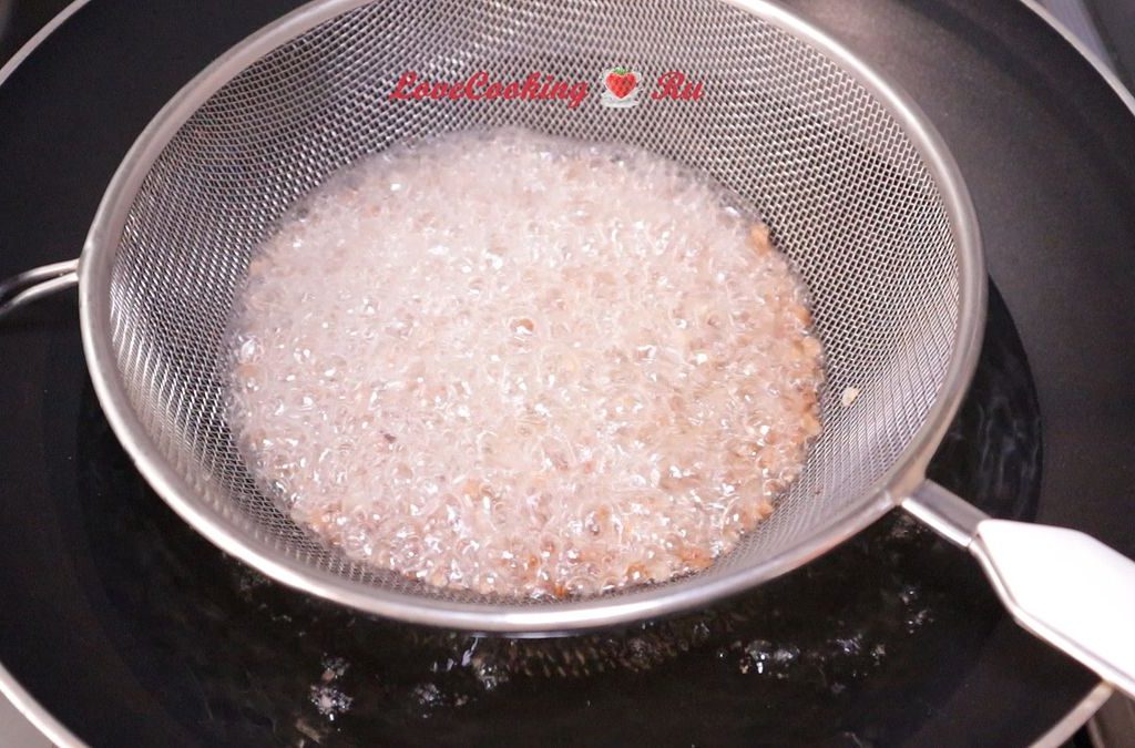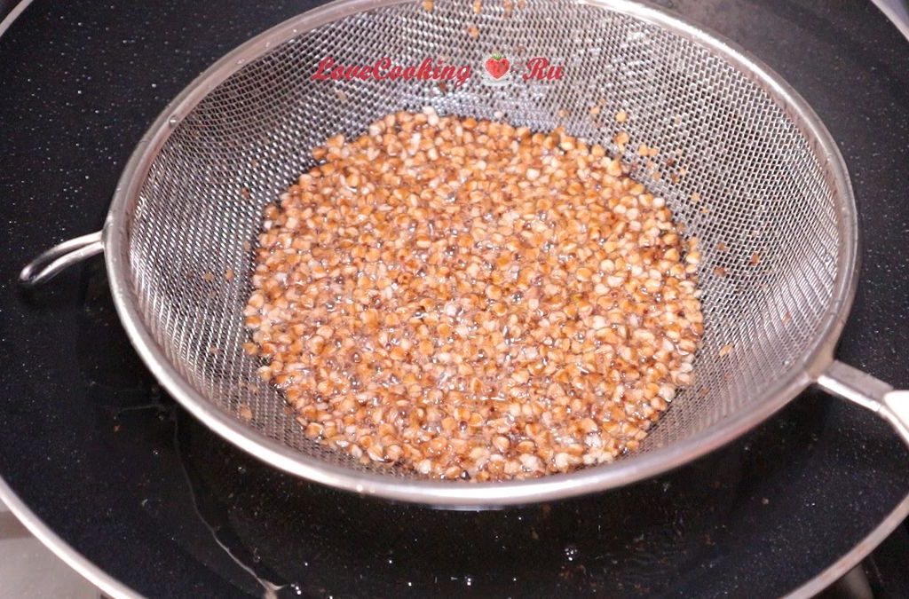 Часть гречки пересыпаем в ситечко. Опускаем сито с гречкой в раскалённое масло и жарим её около 1 минуты. Периодически поднимаем сито, перемешиваем гречку. Вы услышите, как лопаются зёрна гречки. Гречка станет золотистого цвета, раскроется, пойдёт приятный гречневый аромат.