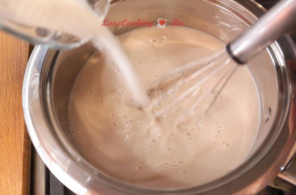 Молоко доводим до кипения, сразу всыпаем пектин с сахаром, при этом активно перемешивая его венчиком.
