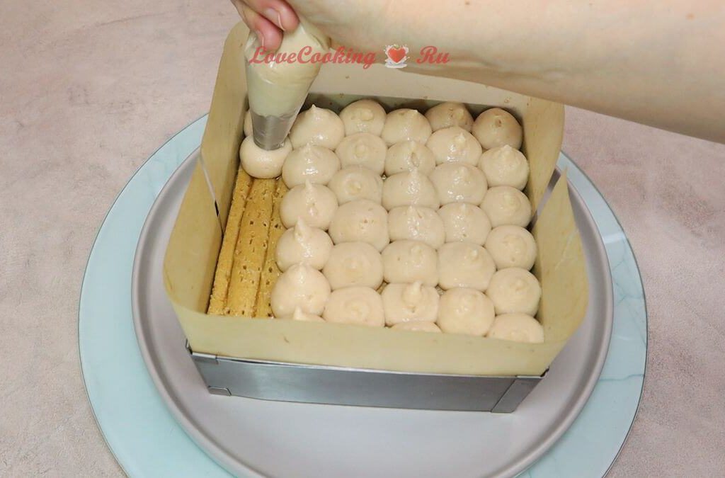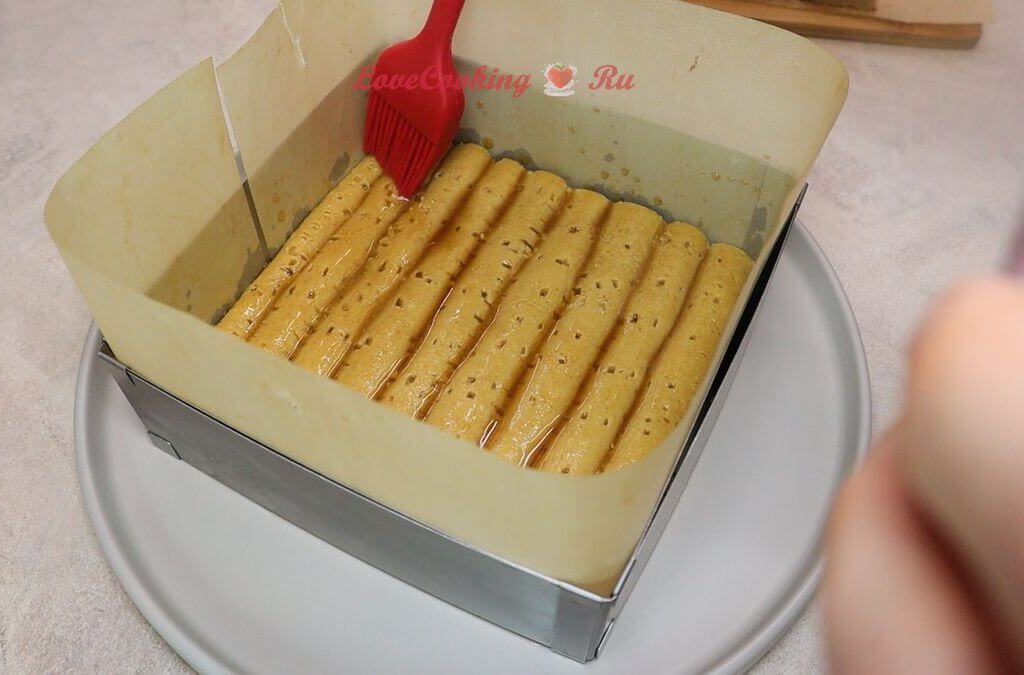 Как я писала выше, собирать можно в виде торта или в виде порционного десерта в стаканчиках. Для сборки я использовала рамку размером 15х15 см, стенки которой застелила тефлоновым ковриком. Так потом легче извлечь десерт.