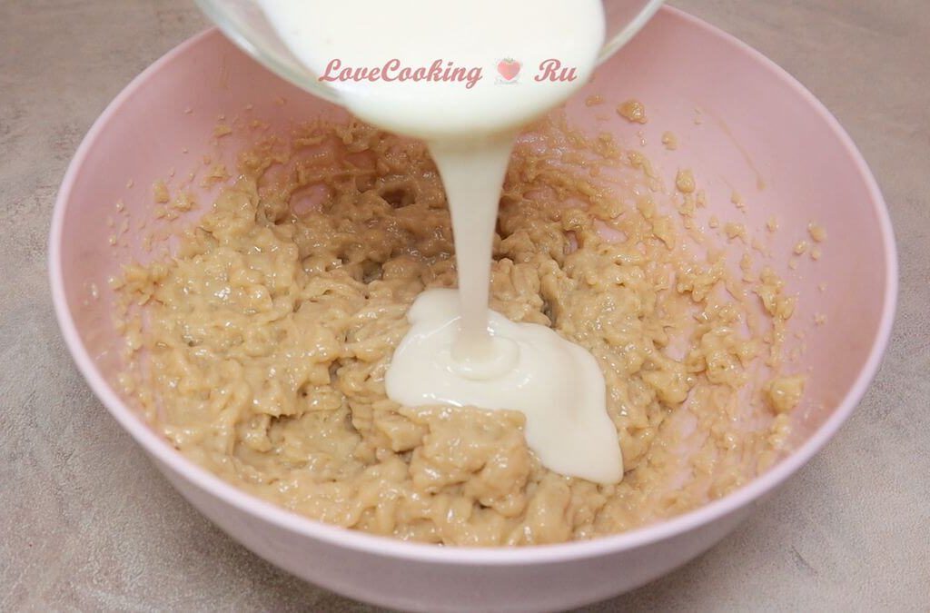 Отдельно перемешиваем сахар (у меня белый и тростниковый), молоко (у меня фундучное), ванилин и уксус. Выливаем в сухие ингредиенты. Перемешиваем.