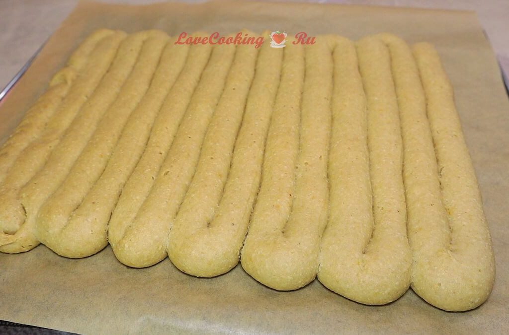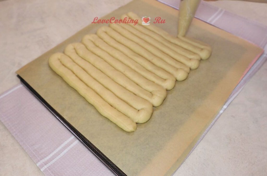 Перекладываем тесто в кондитерский мешок и отсаживаем колбасками на противень, застеленный пергаментной бумагой. У меня получился толстый корж для торта, рекомендую отсаживать толщиной около 8 мм.