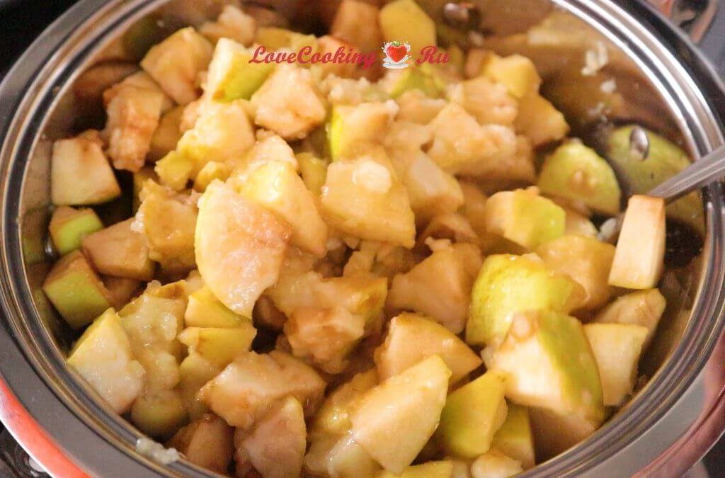 Сбавляем огонь до ниже среднего. Тушим яблоки под крышкой до мягкости, периодически перемешивая. У меня это заняло около 25 минут. Яблоки быстро разварились. Но это зависит от сорта.