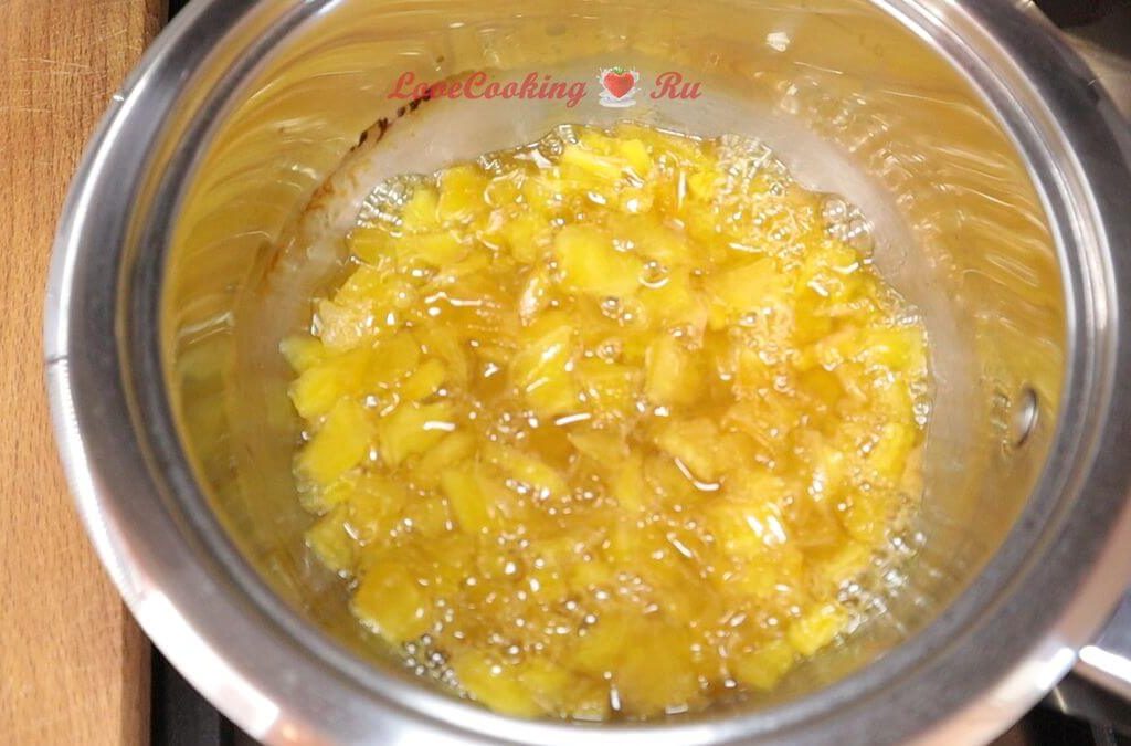 Цукаты у меня очень твёрдые. Я их нарезала, залила водой и коньяком. Проварила, пока вся жидкость не выпарилась. Дала остыть.