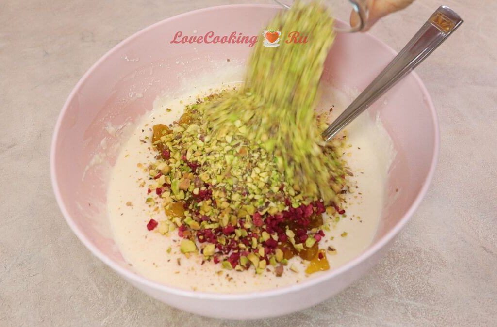 Добавляем цукаты, сублимированную малину и измельчённые фисташки. Перемешиваем.