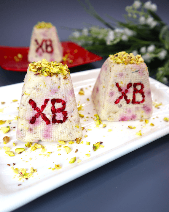Пасху легко извлечь из креманок, потянув за марлю. Она довольно-таки плотная, отлично держит форму. Часть я извлекла из форм, чтобы показать вам, остальные — убрала в морозилку до Пасхи. Размораживать творожную пасху нужно через холодильник.